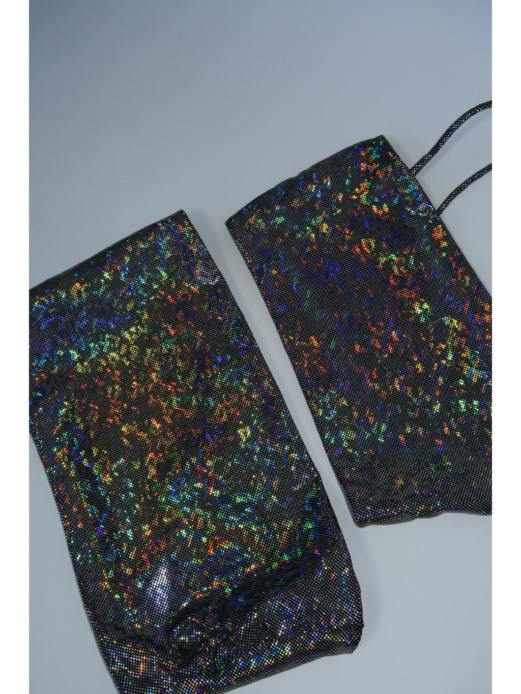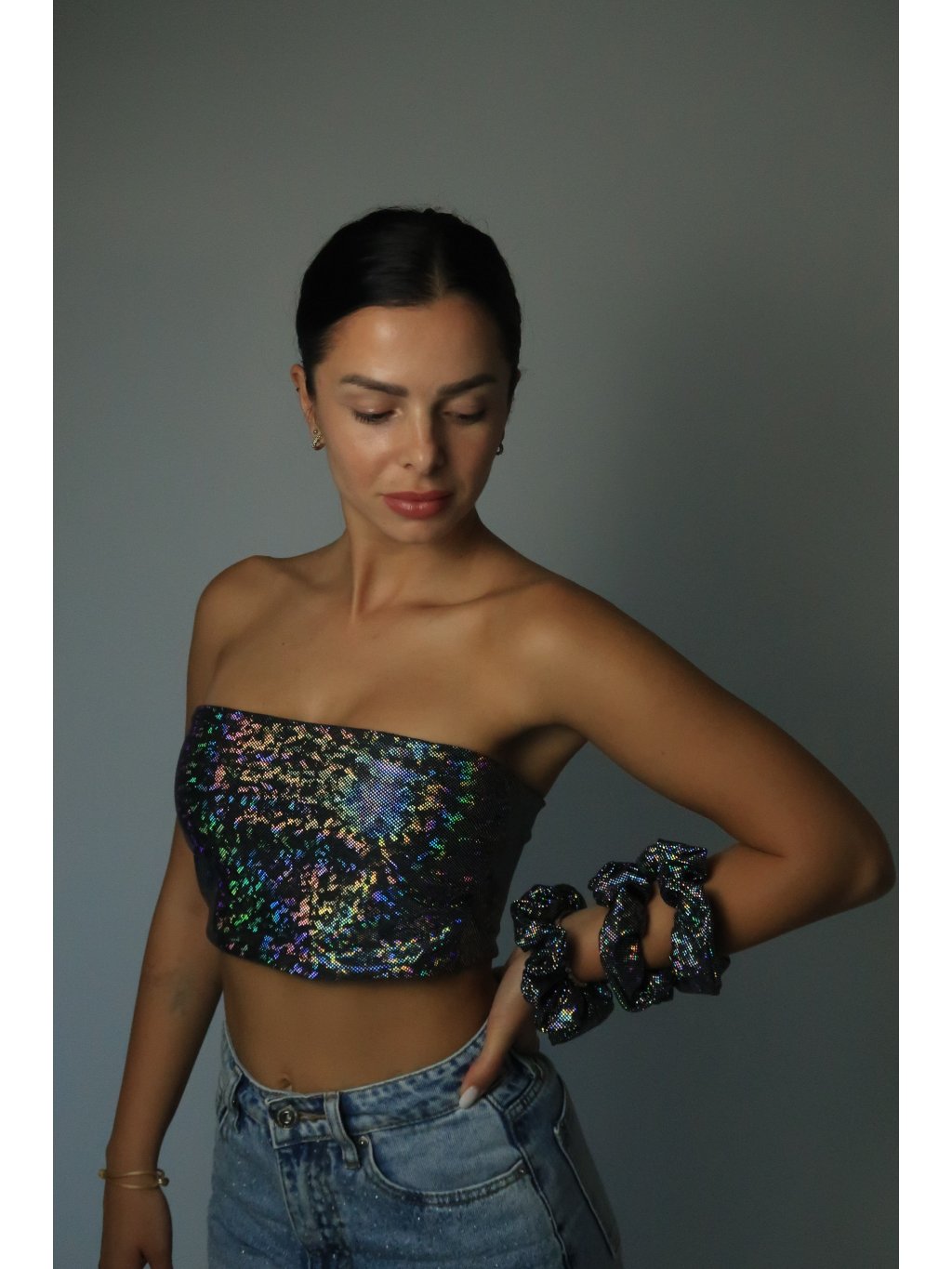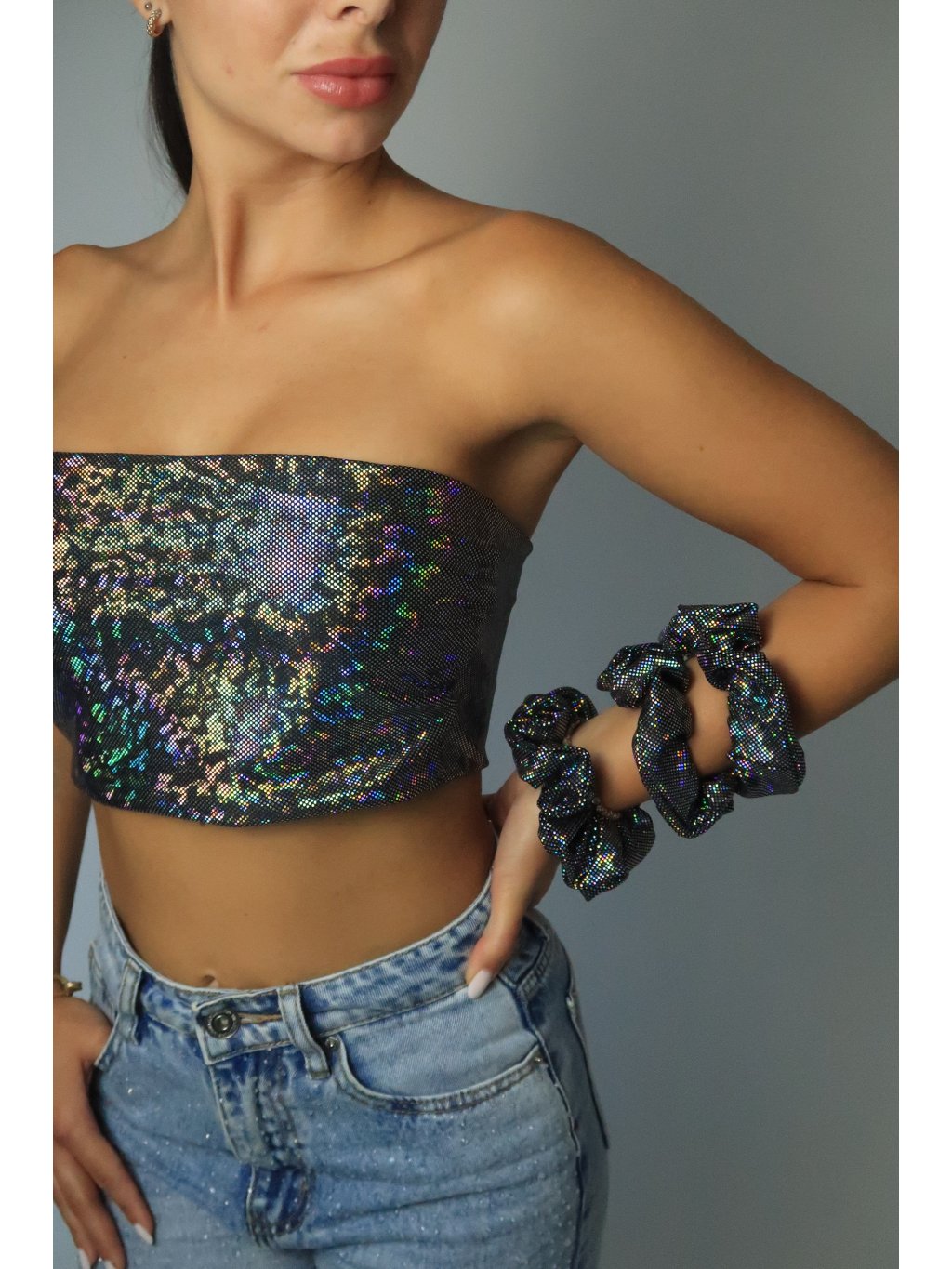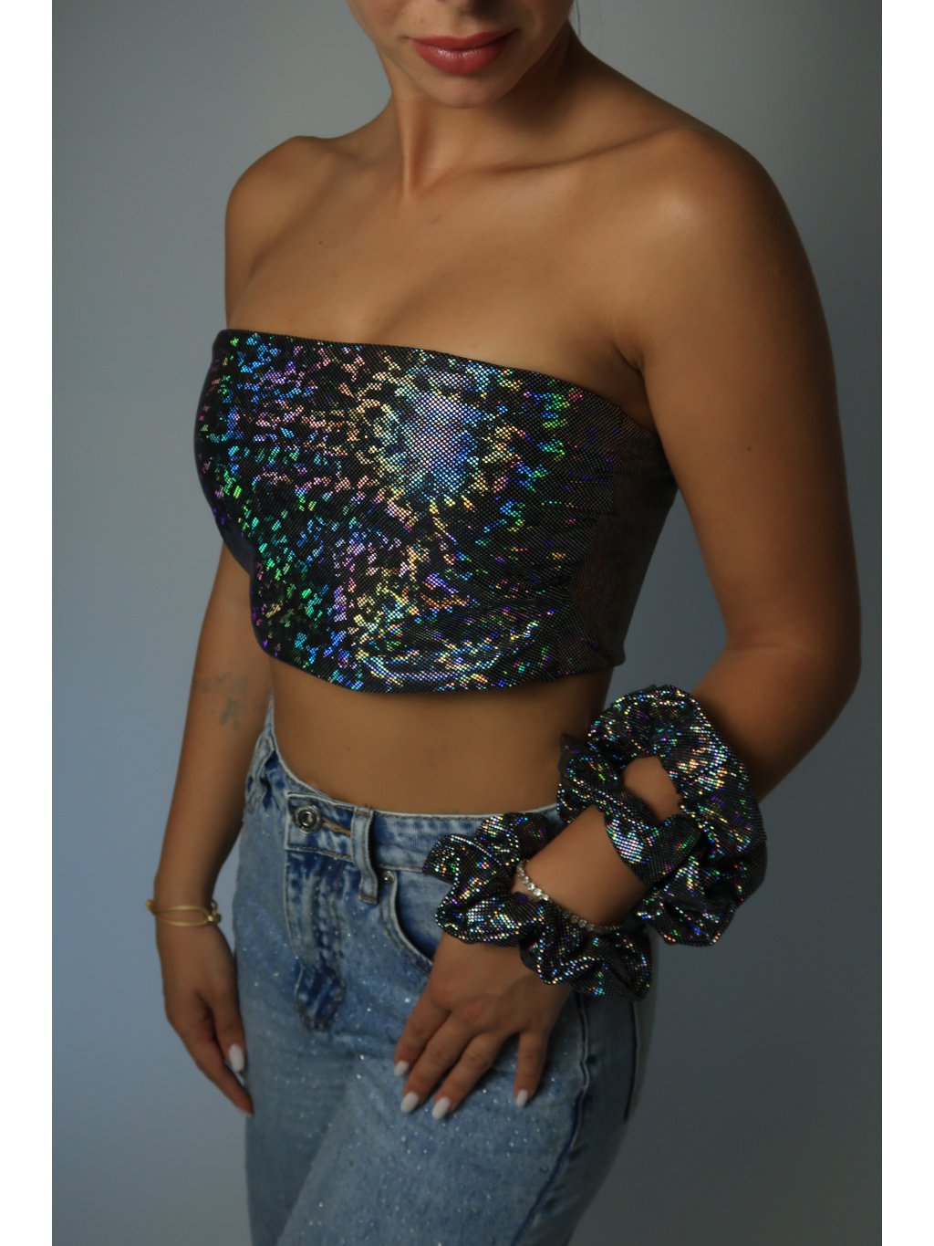 Holografický top bez ramínek s čistým střihem.