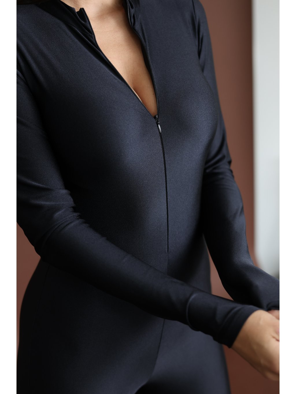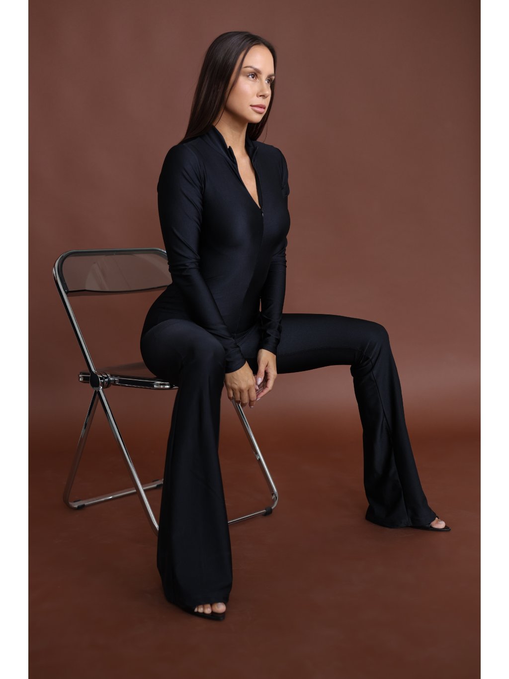 Lesklý overal s dlouhým rukávem a nohavicemi do zvonu, nabízí pohodlí i eleganci v jednom. Praktický zip uprostřed umožňuje snadné oblékání.
