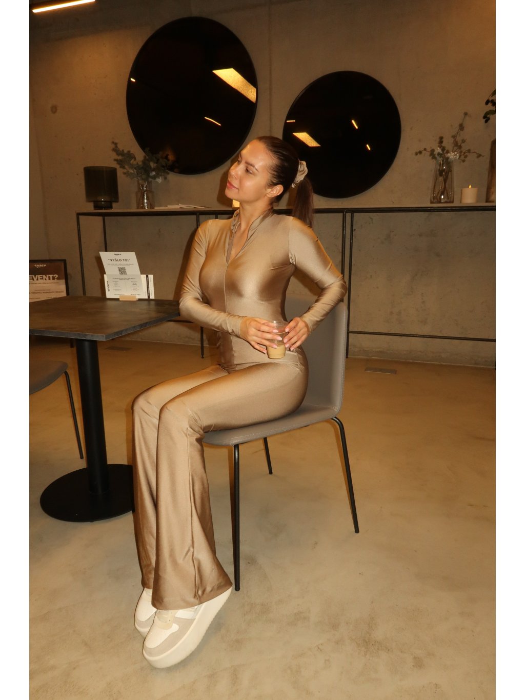 Lesklý overal s dlouhým rukávem a nohavicemi do zvonu, nabízí pohodlí i eleganci v jednom. Praktický zip uprostřed umožňuje snadné oblékání.